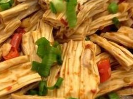 腐竹是我國(guó)傳統(tǒng)的大豆制品,它是將豆?jié){經(jīng)過加熱煮沸后,挑出表面形成的一層薄膜,再經(jīng)干燥或者烘干而成,可以說是豆?jié){中精華部分集合而成。有的地方腐竹又叫腐皮、豆腐棍、豆棍、豆筋等,人稱大豆中的“黃金”。