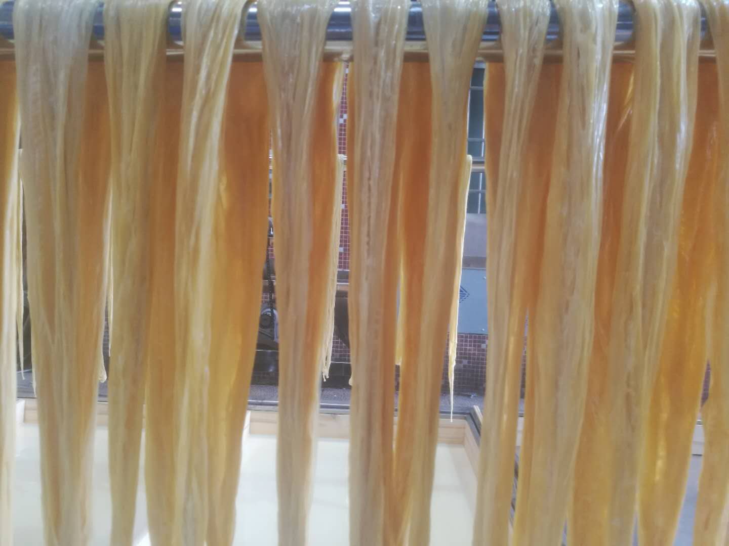 “一洗豆、二浸豆、三打漿、四隔渣、五擰漿、六煮漿、七鏟邊、八提膜、九掛灶、十曬晾”,遵照傳統(tǒng)古法,盡可能手工制作,還原腐竹本味。豆?jié){煮沸時,上層凝固的部分成條的挑起來,晾干后就成了腐竹,用水泡開后就可以拿來烹飪了,吃著又鮮又滑。現(xiàn)在的人多數(shù)是用腐竹機來半自動化制作腐竹,效率高。